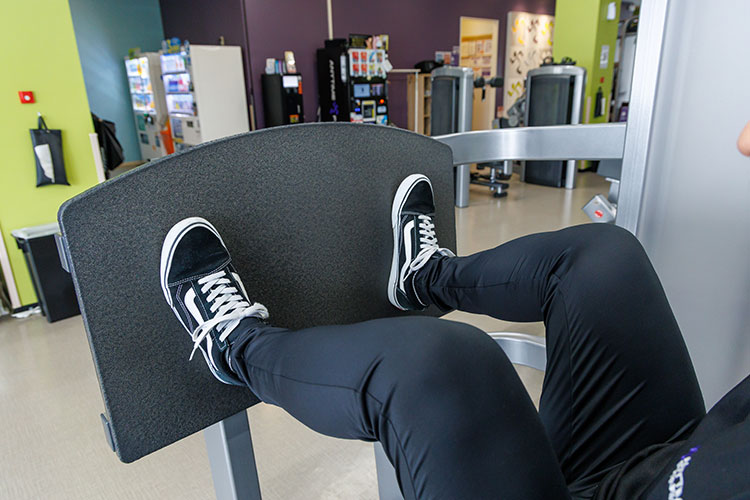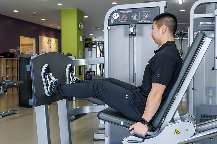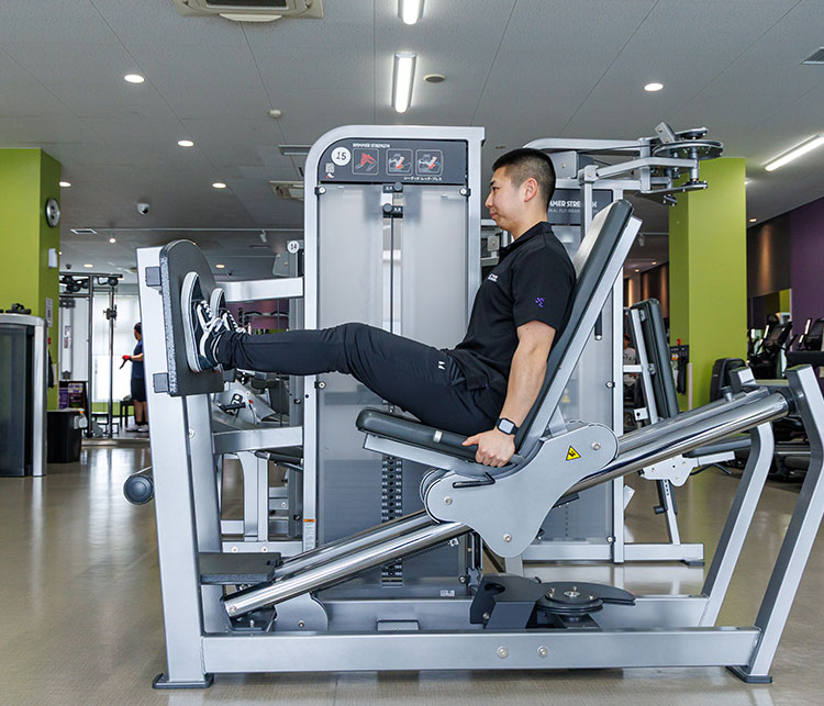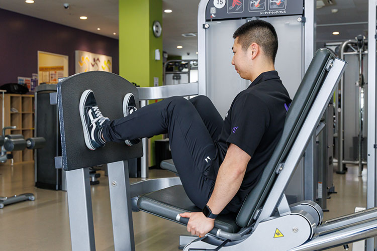 足を置く位置によって負荷のかかる部位が変わります。上部は太もも裏側、下部は前側、中央は全体に効きます。