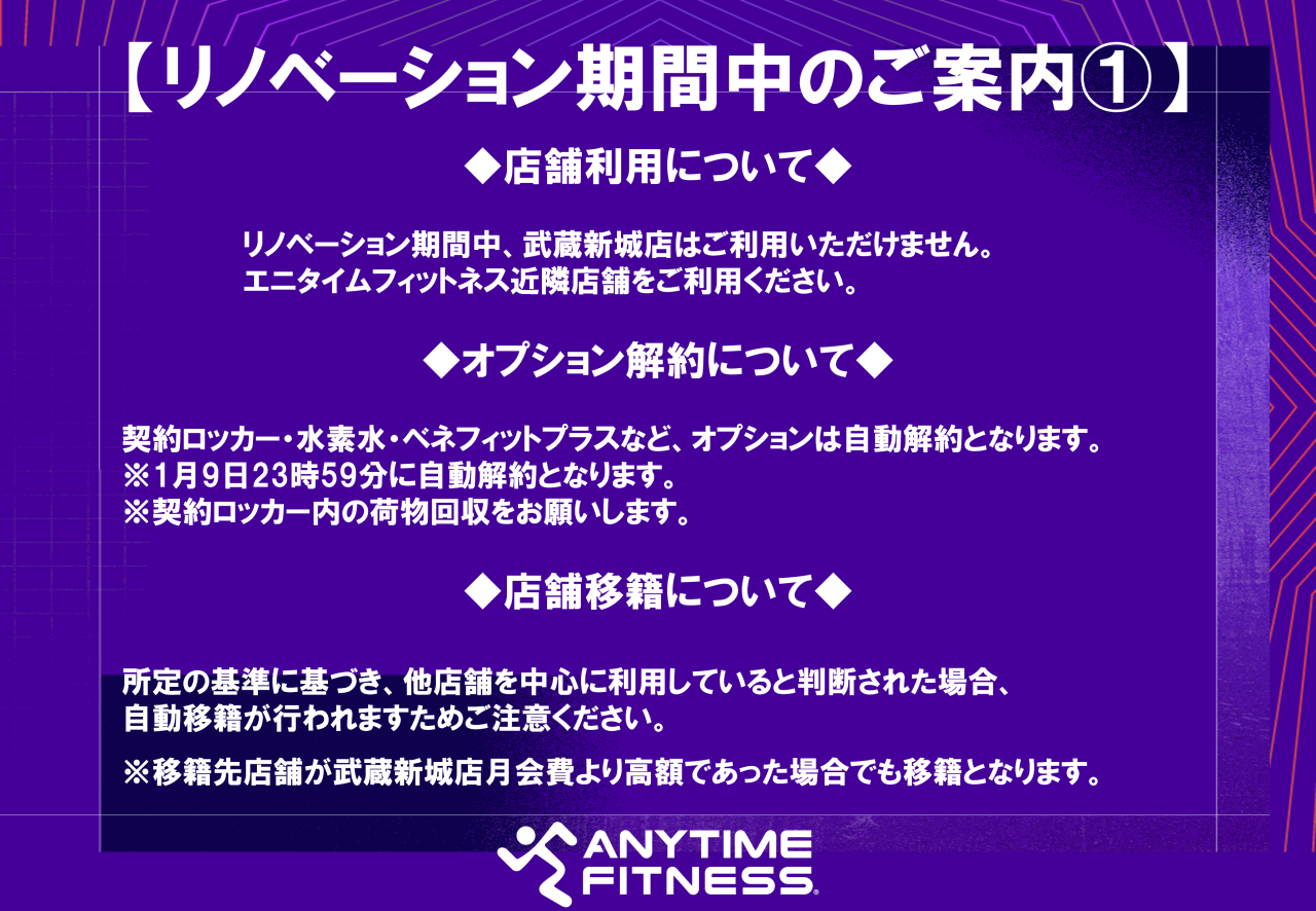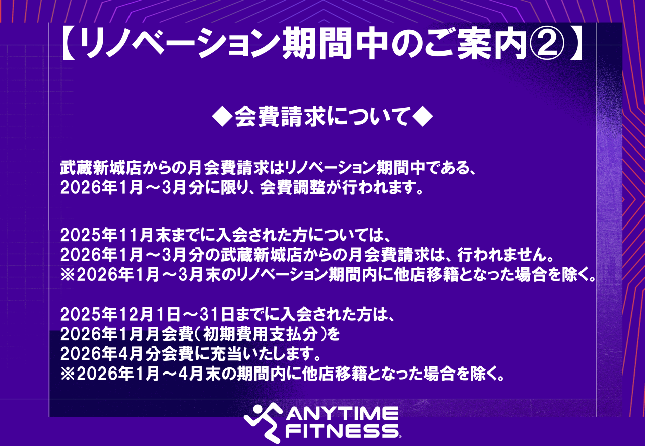 2026年1月~3月分の武蔵新城店からの月会費請求は、行われません。